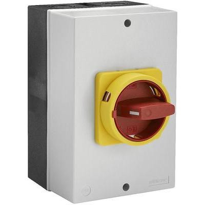 Interruptor Seccionador Paro de Emergencia de 3 polos hasta 63A/22KW en Cofre de Plástico IP66 con Mando Amarillo-Rojo Bloqueable por hasta 3 candados en posición OFF