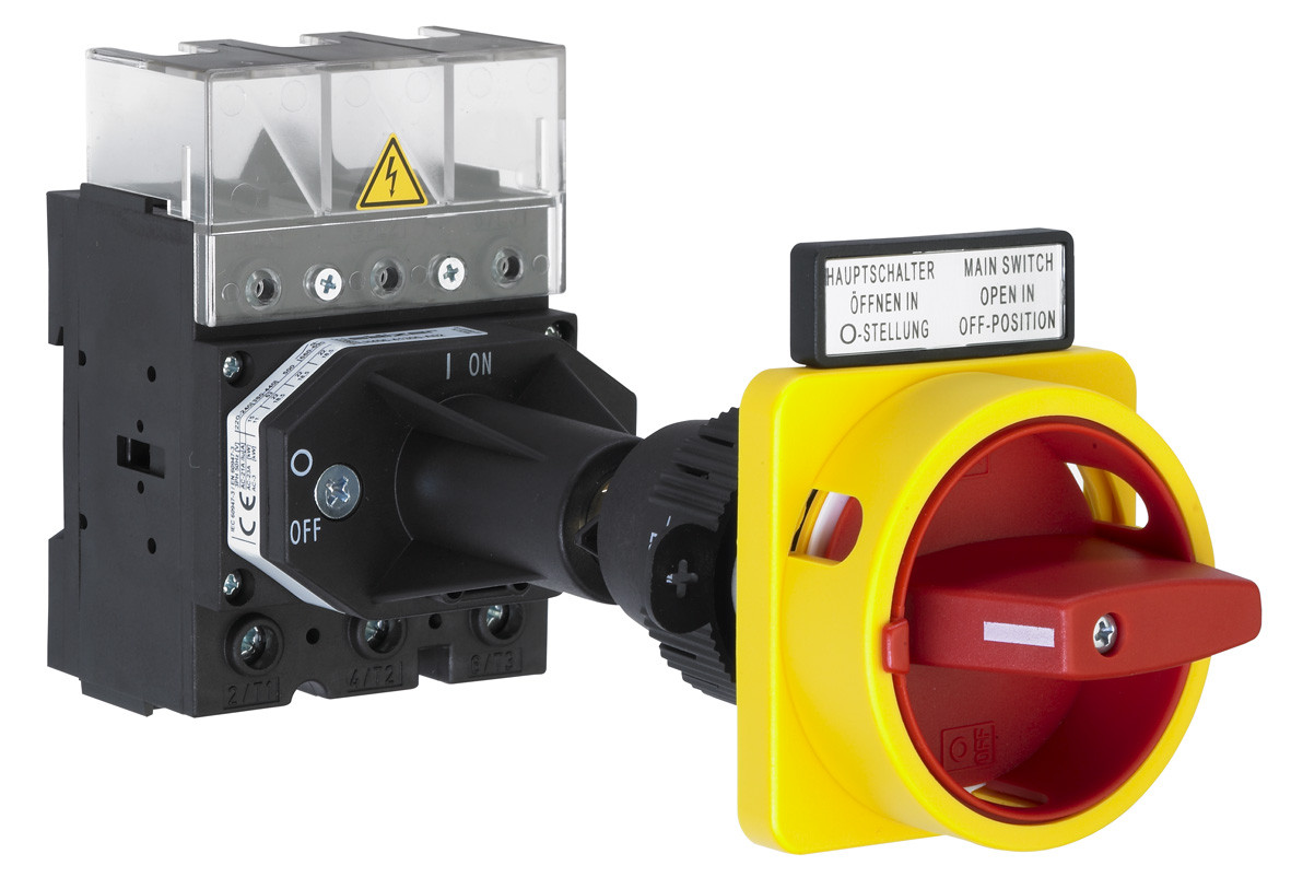 Interruptor Seccionador de Paro de Emergencia de 3 polos hasta 125A / 45kW con montaje fondo de armario (mando en puerta y cuerpo en carril DIN unidos por prolongador metálico cortable AVA8).