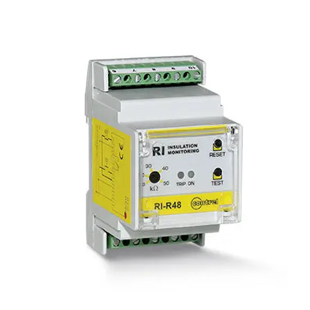 El RI-R48 es un supervisor de aislamiento para sistemas IT (neutro aislado) de 24 a 48VAC/DC. Monitoriza la resistencia de aislamiento a tierra, señalizando cuando el valor de la red se encuentra por debajo del umbral definido. Incluye pulsador de prueba, y el rearme después de fallo es manual.